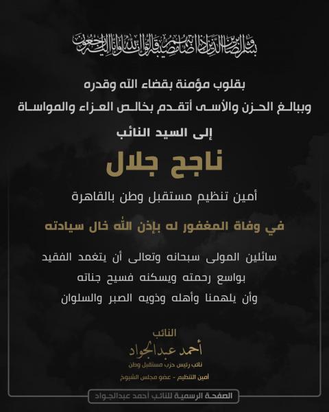 وحرص النائب أحمد عبدالجواد،علي تقديم تعازيه إلي النائب ناجح جلال،عبر حسابه الرسمي بموقع التواصل الإجتماعي"فيس بوك" في رسالة ،شملت كل معاني العزاء والمواساة قال فيها"أتقدم بصادق التعازي والمواساة إلى السيد النائب ناجح جلال - أمين تنظيم مستقبل وطن بالقاهرة.. في وفاة المغفور له بإذن الله خال سيادته.