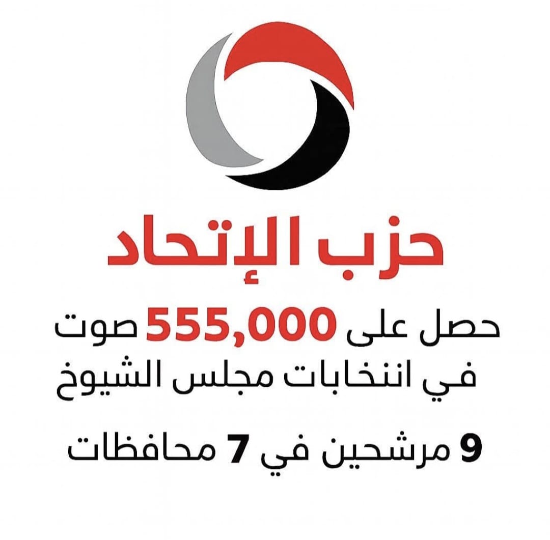 أكد حزب الاتحاد في بيان صحفي له بعد إعلان نتائج إنتخابات مجلس الشيوخ، وجاء فيه :انه على مدار ثلاث سنوات من عمل و جهد وتواصل مع المواطن المصرى تحت شعار من أجل الوطن والمواطن قيادات وأبناء حزب الاتحاد في كل ربوع الوطن. جهد أثمر عن ثقة جماهيرية واسعة تُرجمت إلى أصوات صادقة في صناديق الانتخابات.