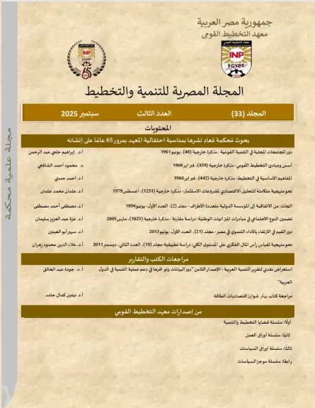 في إطار الدور الرائد الذي يضطلع به معهد التخطيط القومي في دعم منظومة البحث العلمي وإثراء الفكر التنموي في مصر والعالم العربي، أعلن المعهد عن صدور عدد سبتمبر 2025 من المجلة المصرية للتنمية والتخطيط، التي تصدر عن المعهد بانتظام منذ اثنين وثلاثين عامًا، متضمنةً مجموعة متميزة من البحوث المحكمة والمقالات الفكرية التي تجسد مسيرة تطور الفكر التخطيطي والتنمية الاقتصادية في مصر.