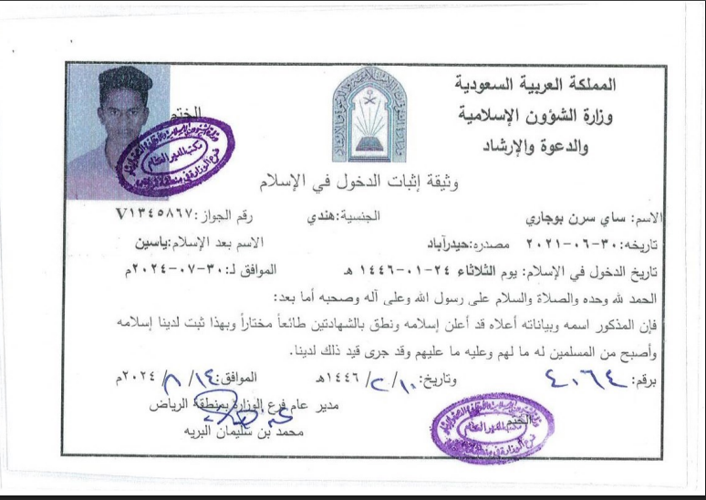 شهدت المملكة العربية السعودية وتحديدًا منطقة الرياض، إشهار الشاب الهندي ساي سرن بوجاري وأصبح اسمه بعد الإسلام ياسين وذلك بتاريخ ١٤٤٦/١/٢٤.