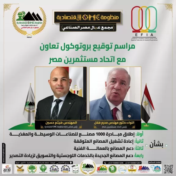في إطار الجهود المبذولة لتعزيز التنمية الصناعية وتحفيز الاستثمار المحلي، وقّع الاتحاد المصري للجمعيات ومؤسسات المستثمرين (EFIA) بروتوكول تعاون مشترك مع منظومة OMC الاقتصادية، بحضور ممثلي مجمع عمال مصر الصناعي، بهدف دعم الصناعة الوطنية ودفع عجلة الاقتصاد المصري نحو مزيد من النمو والاستدامة.