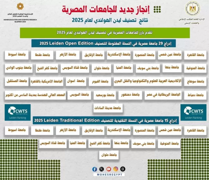 أعلن تصنيف ليدن (CWTS Leiden Ranking) الهولندي نتائجه الجديدة لعام 2025، والتي أظهرت تقدمًا ملحوظًا للجامعات المصرية، وذلك في إطار التقدم المستمر الذي تُحققه الجامعات المصرية في مختلف التصنيفات الدولية المرموقة.