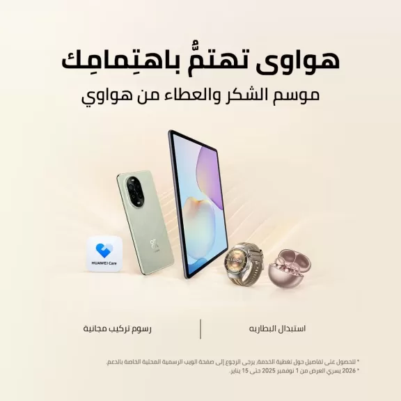 ويمكن لعملاء هواوي أيضًا الاستفادة من العروض والخصومات خلال حملة موسم الشكر، بسهولة من خلال خدمة "من الباب إلى الباب"، التي توفرها الشركة دون أي مصاريف شحن، مما يضمن تجربة مريحة وسريعة للحصول على خدمات الصيانة، دون الحاجة إلى زيارة مركز الخدمة شخصيًا.