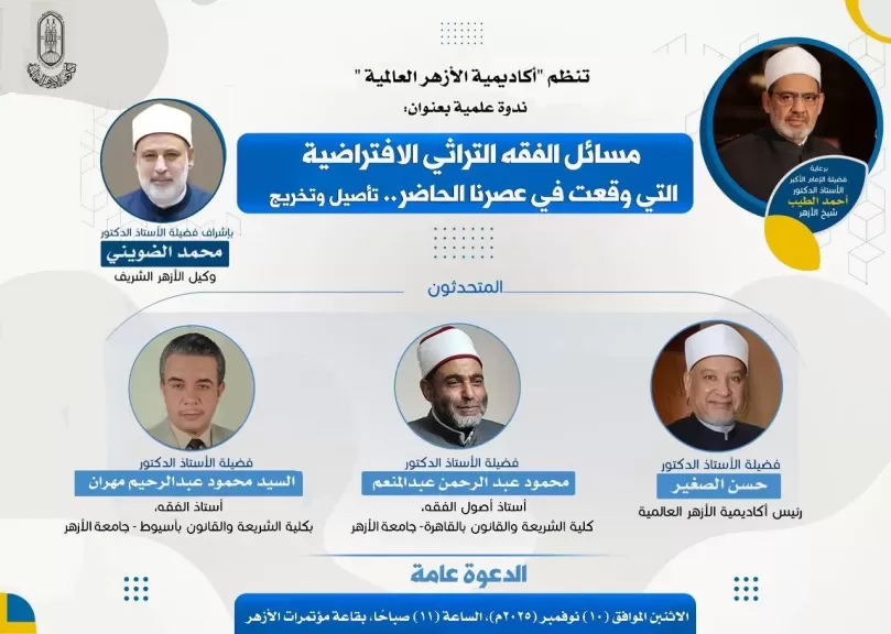 بتوجيهاتٍ كريمةٍ من فضيلة الإمام الأكبر الدكتور أحمد الطيب، شيخ الأزهر الشريف، وإشراف فضيلة الدكتور محمد الضويني، وكيل الأزهر الشريف؛ تنظم "أكاديمية الأزهر العالمية" ندوةً علميةً بعنوان:"مسائل الفقه التراثي الافتراضية التي وقعت في عصرنا الحاضر.. تأصيل وتخريج”، وذلك يوم الاثنين القادم في تمام الساعة (١١) صباحًا بقاعة مؤتمرات الأزهر الحديثة، والدعوة عامة لجميع الباحثين والمختصين.