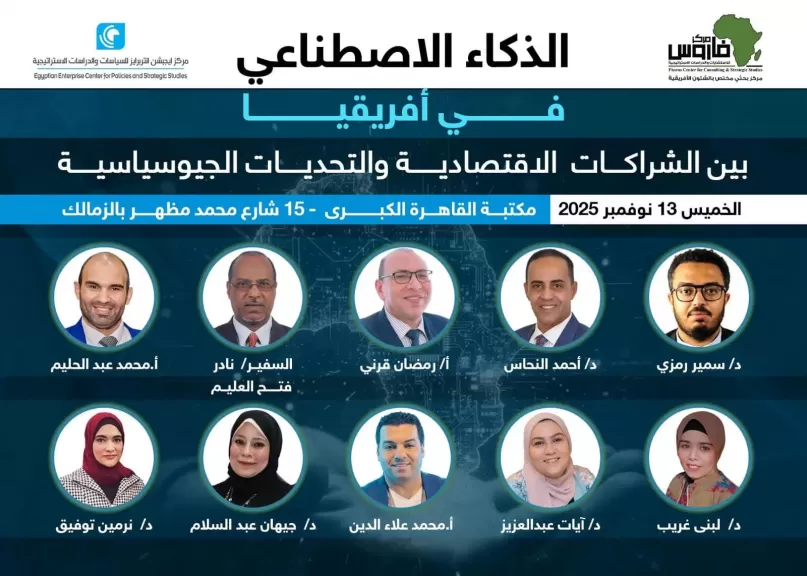 وفي هذا الإطار، ينظم مركز إيجبشن إنتربرايز للسياسات والدراسات الاستراتيجية، بالتعاون مع مركز فاروس للاستشارات والدراسات الاستراتيجية، ورشة عمل بعنوان: «الذكاء الاصطناعي في إفريقيا: بين الشراكات الاقتصادية والتحديات الجيوسياسية» وذلك في تمام الساعة الرابعة مساءً من يوم الخميس 13 نوفمبر 2025، بمقر مكتبة القاهرة الكبرى بالزمالك.