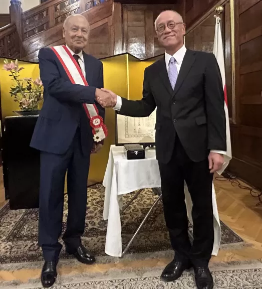 خلال حفل التتويج، وفي البداية، قام السفير إيواي بتعريف السادة الحضور بإنجازات معالي الأمين العام السابق ذكرها، كم تقدم له بالتهنئة على التتويج بهذا الوسام المرموق، وأعرب له عن تطلعه إلى مواصلة مساهماته في تعزيز علاقات الصداقة الودية مع اليابان.