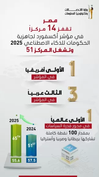 جاءت مصر فى المرتبة الأولى إفريقيًا فى مؤشر جاهزية الحكومات للذكاء الاصطناعى لعام 2025 الصادر عن Oxford Insights، حيث تقدمت 14 مركزًا في المؤشر لتشغل المركز 51 عالميًا من بين 195 دولة، محققة 57.5 نقطة، مقارنة بالمركز 65 من بين 188 دولة محققة 55.6 نقطة فى عام 2024. كما جاءت مصر فى المرتبة الثالثة عربيًا، مقابل المركز السابع عربيًا فى العام الماضى.