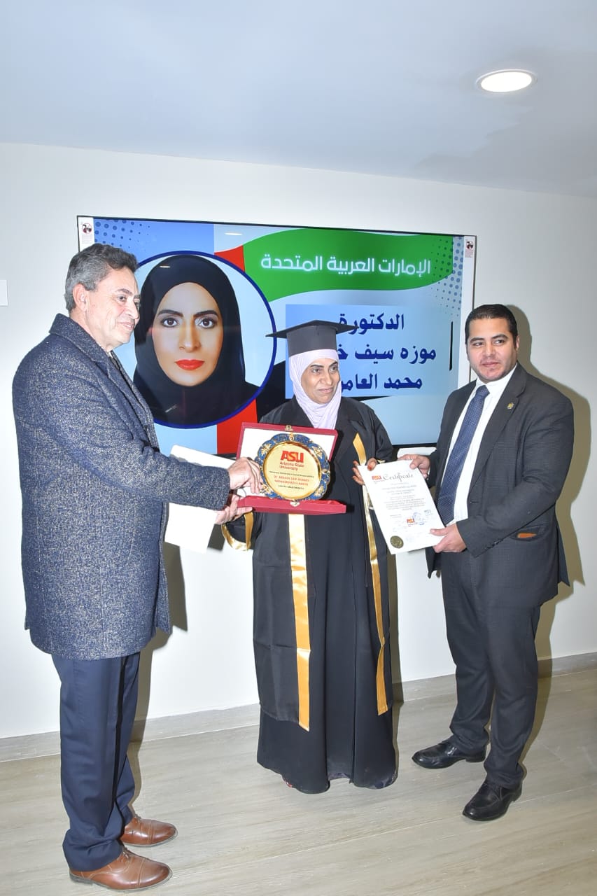 حصدت الدكتورة موزة سيف خميس العامري، من دولة الإمارات العربية المتحدة، الدكتوراه الفخرية من جامعة أريزونا بالولايات المتحدة الأمريكية، وذلك خلال فعاليات الندوة العلمية للعلوم الإنسانية لبناء الإنسان، التي عُقدت في شهر يناير 2026 بفندق النبيلة كايرو بجمهورية مصر العربية، تقديرًا لإسهاماتها النوعية في مجالات التنمية المجتمعية، وبناء القدرات، والتخطيط الاستراتيجي، وتمكين الأسرة.