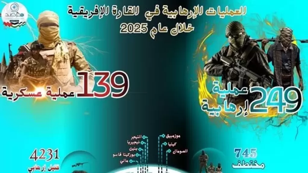 وأوضح المرصد أن عدد العمليات الإرهابية في إفريقيا سجّل تراجعًا طفيفًا من 252 عملية في 2024 إلى 249 عملية في 2025 بنسبة انخفاض بلغت 1.19%، وهو ما يعكس استقرارها نسبيًّا في وتيرة الهجمات، دون أن يعني تحسنًا جذريًّا في الوضع الأمني.