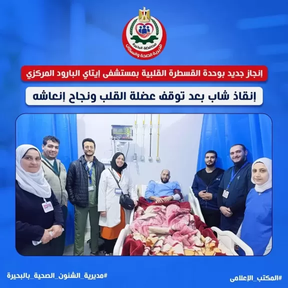 في تدخل طبي سريع وعاجل ، نجح الفريق الطبي بـوحدة القسطرة القلبيه بمستشفى إيتاي البارود المركزي في إنقاذ حياة شاب من الموت المحقق بعد توقف عضلة القلب ، حيث تم عمل قسطرة قلبية عاجلة لإنقاذ الحياة وتركيب 3 دعامات , بعد إعطاء صدمتين كهربائيتين للقلب اثناء محاولة الانعاش ، وانتهاء كافة إجراءات القسطرة القلبية From Door to Ballon خلال ٢٦ دقيقة مما يُعد وقت قياسى لهذا الإجراء الطبى .