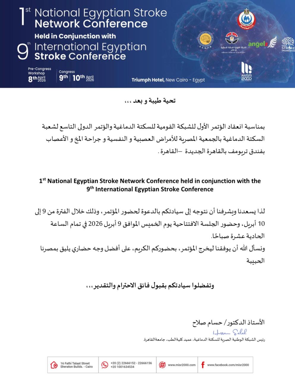 تحت رعاية السيد الاستاذ الدكتور خالد عبدالغفار وزير الصحه و الجمعية المصرية للأمراض العصبية والنفسية وجراحة المخ والأعصاب، تنطلق الجلسة الافتتاحية الكبرى يوم الخميس 9 أبريل في تمام الـ11 صباحاً. ومن المتوقع أن يشهد المؤتمر الإعلان عن استراتيجيات جديدة لربط المستشفيات المصرية بشبكة قومية موحدة، تضمن وصول العلاج المذيب للجلطات لأي مريض في وقت قياسي.