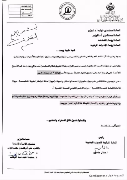 أصدرت وزارة الصحة والسكان، اليوم، كتاباً دورياً لكافة قطاعاتها وهيئاتها، بشأن تفعيل نظام العمل عن بُعد (Work from Home) ليوم الأحد من كل أسبوع خلال شهر أبريل ٢٠٢٦، وذلك اعتباراً من الأحد الموافق ٥ أبريل ٢٠٢٦، تنفيذاً لقرار السيد الدكتور رئيس مجلس الوزراء بشأن خطة ترشيد استهلاك الطاقة وتخفيف الأحمال.