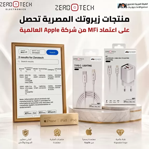 حصلت شركة زيروتك إلكترونيكس بالتعاون مع مصنع الالكترونيات في الهيئة العربية للتصنيع على اعتماد MFi من شركة Apple العالمية لمنتجاتها من الشواحن (الكوابل والأدابتور)،