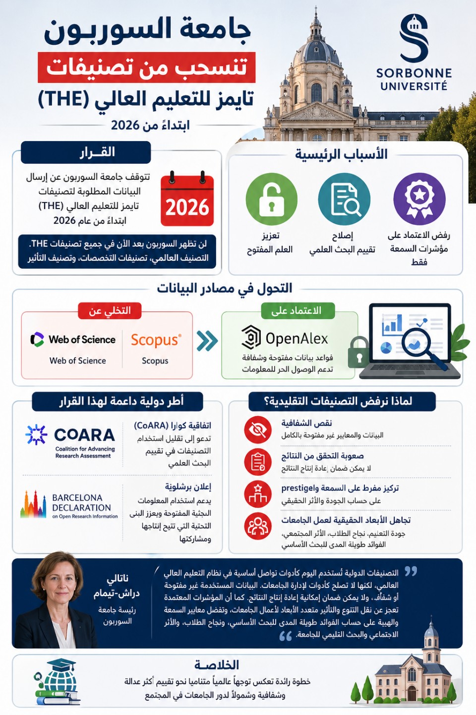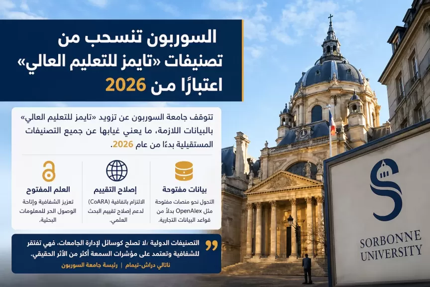 باريس – أعلنت Sorbonne University انسحابها من التصنيفات العالمية التي تصدرها Times Higher Education (THE)، اعتبارًا من عام 2026، في خطوة تعكس تحولًا استراتيجيًا نحو تعزيز مبادئ العلم المفتوح وإعادة تشكيل آليات تقييم البحث العلمي.