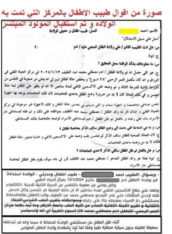 ثالثا: كانت الأم تتابع الحمل في المستشفى منذ الشهر الثاني وحتى الشهر الثامن، وقد طلبت إجراء ولادة مبكرة قيصرية رغم تحذير الطبيب المعالج من خطورة ذلك على حياة الجنين، إذ أكد أن الجنين لم يكتمل نموه وأن التعجيل بالولادة في ذلك التوقيت يُشكل خطرًا جسيمًا على حياته لعدم وجود مبرر طبي للولادة المبكرة.